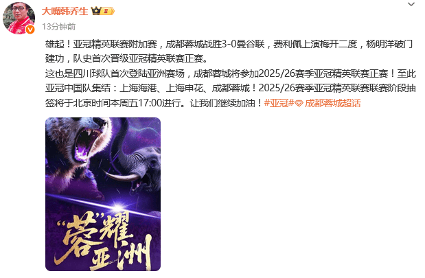 韩乔生:雄起!亚冠精英联赛附加赛,成都蓉城战胜3-0曼谷联,费利佩上演梅开二度,杨明洋破门建功,队史首次晋级亚冠精英联赛正赛。