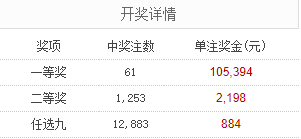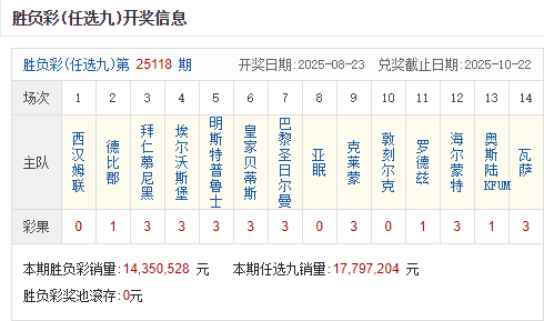 足彩25118期开奖结果:一等奖61注 单注奖金10.5万元