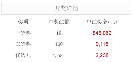 北京时间8月28日,足彩25121期开奖。本期全国中出一等奖18注,每注奖金846,069元,二等奖中出460注,每注奖金9,116元。另外,任选9场中出4,581注,每注奖金2,238元。