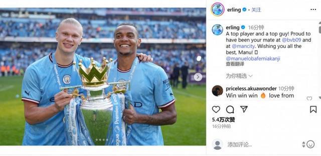 哈兰德写道:“一位顶级球员,也是顶级的好兄弟!很自豪曾在多特蒙德和曼城与你并肩作战。祝你一切顺利,Manu!”