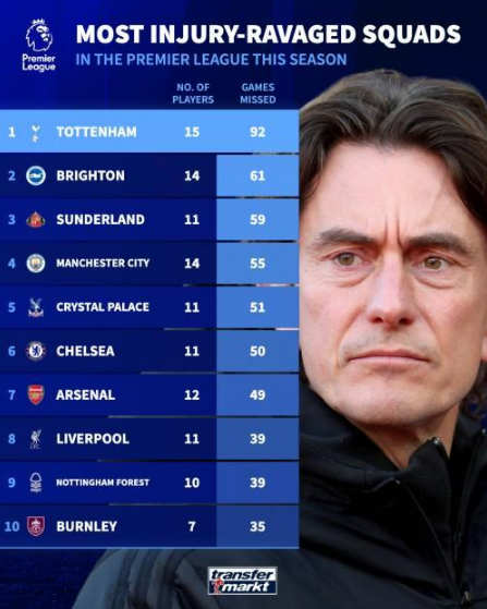 1. 托特纳姆热刺 15人受伤 合计缺阵92场
