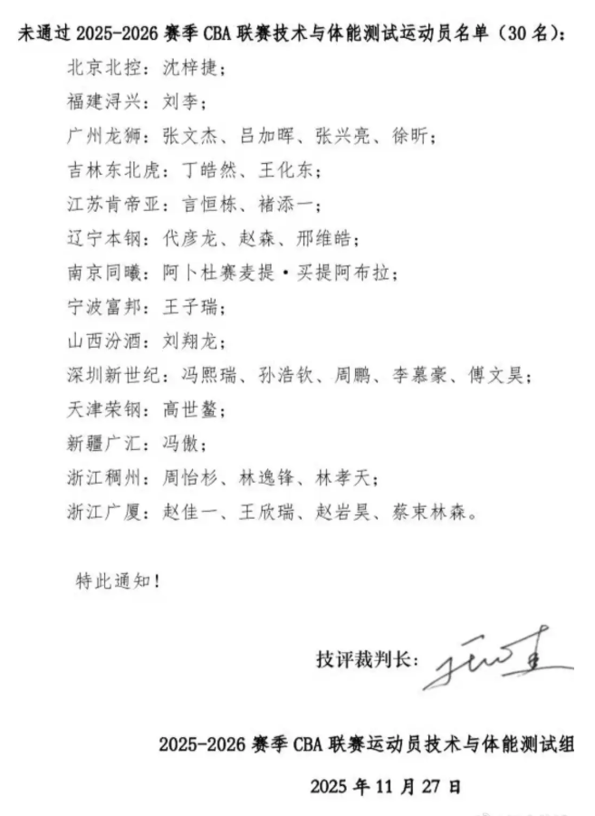 曝CBA体测30名运动员未通过 需要进行补测 时间:2025-11-29 10:19:45 北京时间11月27日消息,据媒体透露,本次CBA体测共有30名运动员未能通过,需要进行补测。具体名单如下: 相关消息 ·官宣!广东签下CBA得分王 萨姆纳上赛季场均36分 ·廖三宁:输球因自身发挥出问题 要相信教练组 ·男篮世预赛-中国台北64-90不敌日本男篮 林庭谦13+6 ·郭士强:主场输韩国确实可惜 打好客场需注意两点