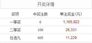 北京时间11月29日,足彩25174期开奖。本期全国中出一等奖6注,每注奖金1,105,922元,二等奖中出108注,每注奖金26,331元。另外,任选9场中出925注,每注奖金11,229元。