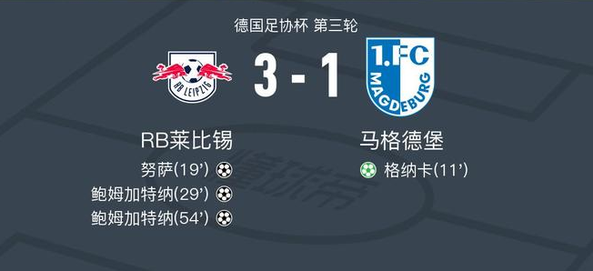 北京时间12月3日德国足协杯 第三轮,RB莱比锡对阵马格德堡。上半场,格纳卡点球主罚命中,扬-迪奥曼德助攻努萨远射破门,哈德助攻鲍姆加特纳捅射破门;下半场,努萨助攻鲍姆加特纳上演梅开二度,马克西莫维奇破门被判越位进球无效。最终比分RB莱比锡 3-1 马格德堡。
