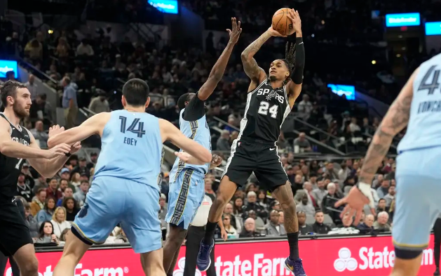 第二节,局势稍显波动,马刺依旧未能压制住灰熊的进攻,一度落后6分。随着比赛的推进,马刺在场上找到配合,逐渐恢复状态,凭借稳定的进攻将比分迅速追平,并在随后的进攻中反超至领先7分。到了节末,灰熊通过调整和坚韧的防守,再次缩小了分差。第二节结束,马刺以63-59保持领先。