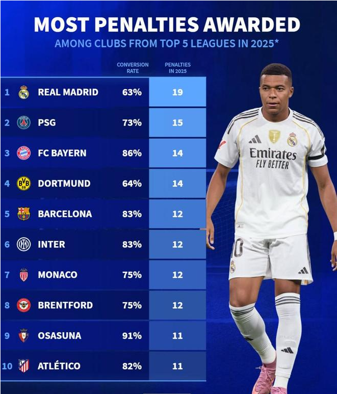 2025年五大联赛俱乐部点球数TOP10:皇马、巴黎、拜仁