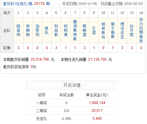 北京时间12月5日,足彩25178期开奖。本期全国中出一等奖6注,每注奖金1,868,144元,二等奖中出233注,每注奖金20,617元。另外,任选9场中出2505注,每注奖金5,400元。