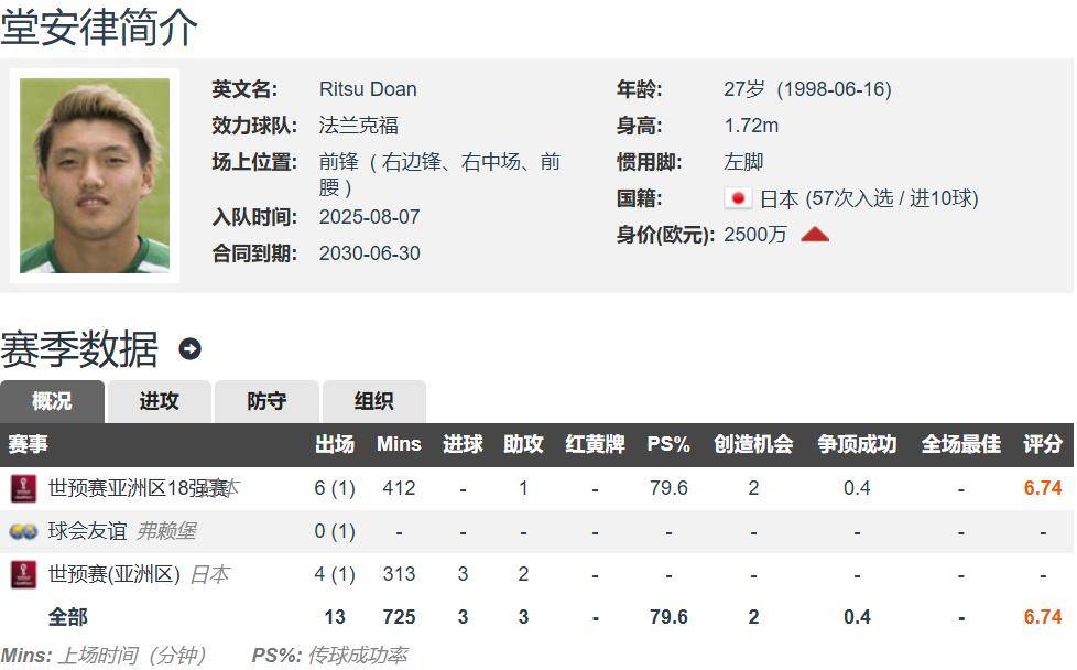 为什么日本足球是亚洲的天花板战力?因为日本队内有一大群在欧洲五大联赛留洋的球员,都是实打实的主力。来自德甲上赛季排名第三球队法兰克福的官方消息,球队签下了27岁的日本国脚堂安律,双方签约5年,至2030年6月底,堂安律将身披20号球衣。