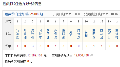 北京时间8月8日,足彩25108期开奖。本期全国中出一等奖27注,每注奖金208,885元,二等奖中出626注,每注奖金3,861元。另外,任选9场中出2446注,每注奖金3,363元。