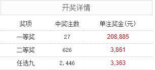 足彩25108期开奖结果:一等奖27注 单注奖金20.8万