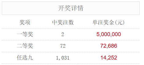 北京时间9月23日,足彩25136期开奖。本期全国中出一等奖2注,每注奖金5,000,000元,二等奖中出72注,每注奖金72,686元。另外,任选9场中出1,031注,每注奖金14,252元。