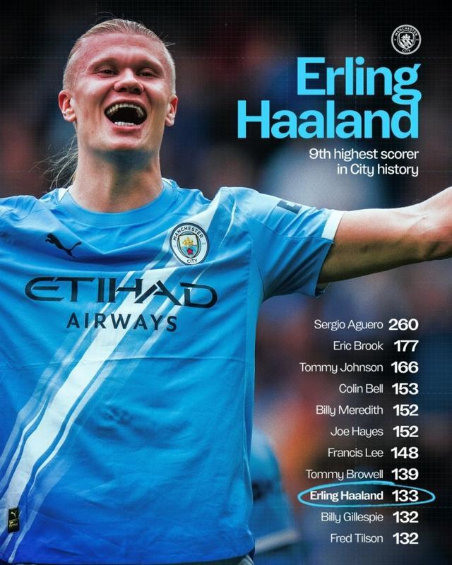 哈兰德为曼城打进133球,排名队史射手榜第9位,曼城官方社媒晒出队史射手榜,配文:“他势不可挡。”