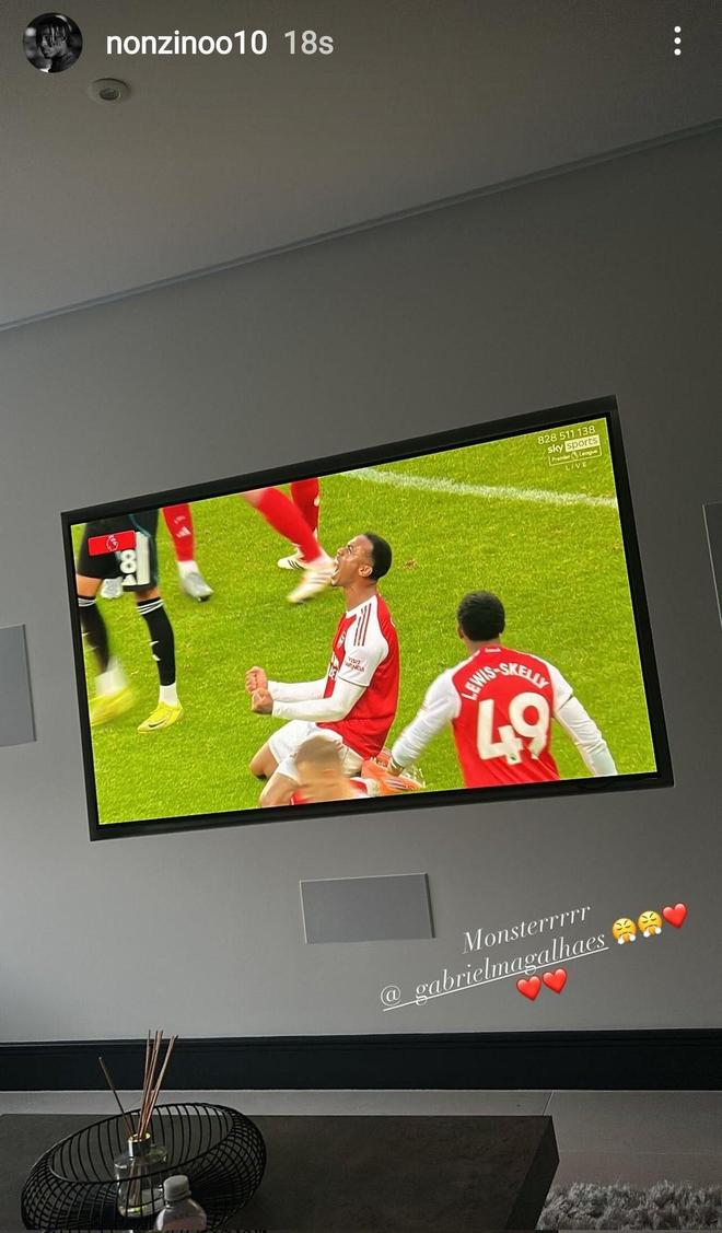 正在家中养伤的马杜埃凯见证了加布里埃尔的绝杀,他在社媒晒图并配文“野兽,加布里埃尔”。