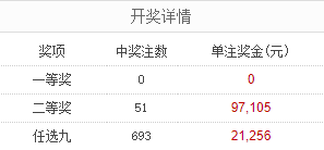北京时间9月28日,足彩25139期开奖。本期全国未有一等奖开出,其中二等奖中出51注,每注奖金97105元。另外,任选9场中出693注,每注奖金21256元。