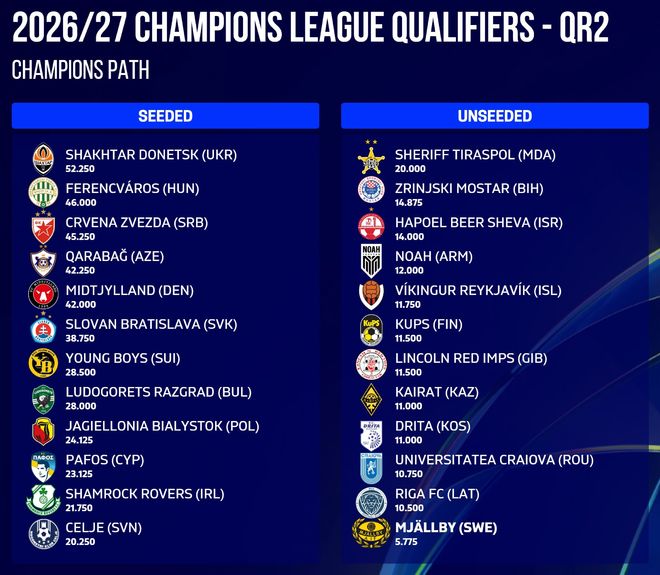 根据欧冠联赛的联赛冠军之路的名额分配规则,本赛季的瑞典超冠军米亚尔比已锁定了26/27赛季欧冠联赛资格赛第二轮的席位。