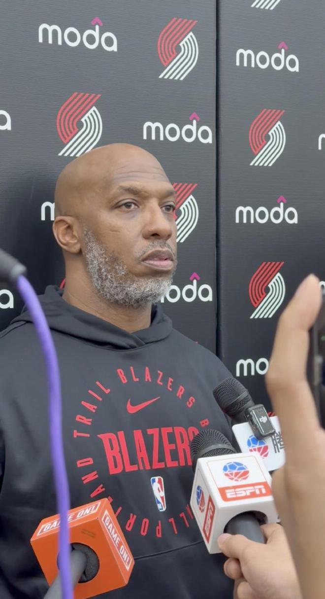 比卢普斯:“我觉得我们队有七个首发,除了明天的先发阵容(霍勒迪、夏普、阿夫迪亚、卡马拉、克林根),我们还有亨德森和格兰特…格兰特在训练营中表现得非常有竞争性…但这就是 NBA。”