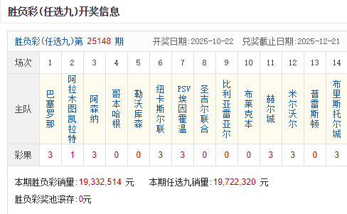足彩25148期开奖结果:一等奖310注 单注奖金2.79万元