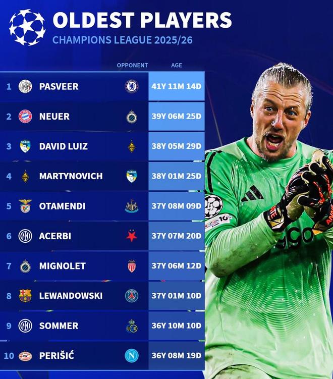 1. 帕斯维尔(阿贾克斯) 41岁11个月14天(vs切尔西)