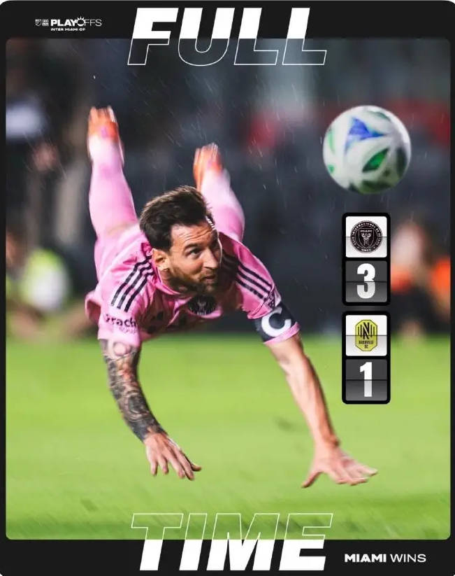 北京时间10月25日早上,2025赛季美职联季后赛1/8决赛在大通体育场展开角逐,迈阿密国际主场对阵纳什维尔。上半场,苏亚雷斯助攻梅西鱼跃头球破门。下半场,阿连德头球建功,梅西再下一城收获生涯第891球,穆赫塔尔在尾声阶段任意球直接破门。最终,迈阿密国际主场3-1战胜纳什维尔占据先机。11月2日,双方将进行第二回合的较量。