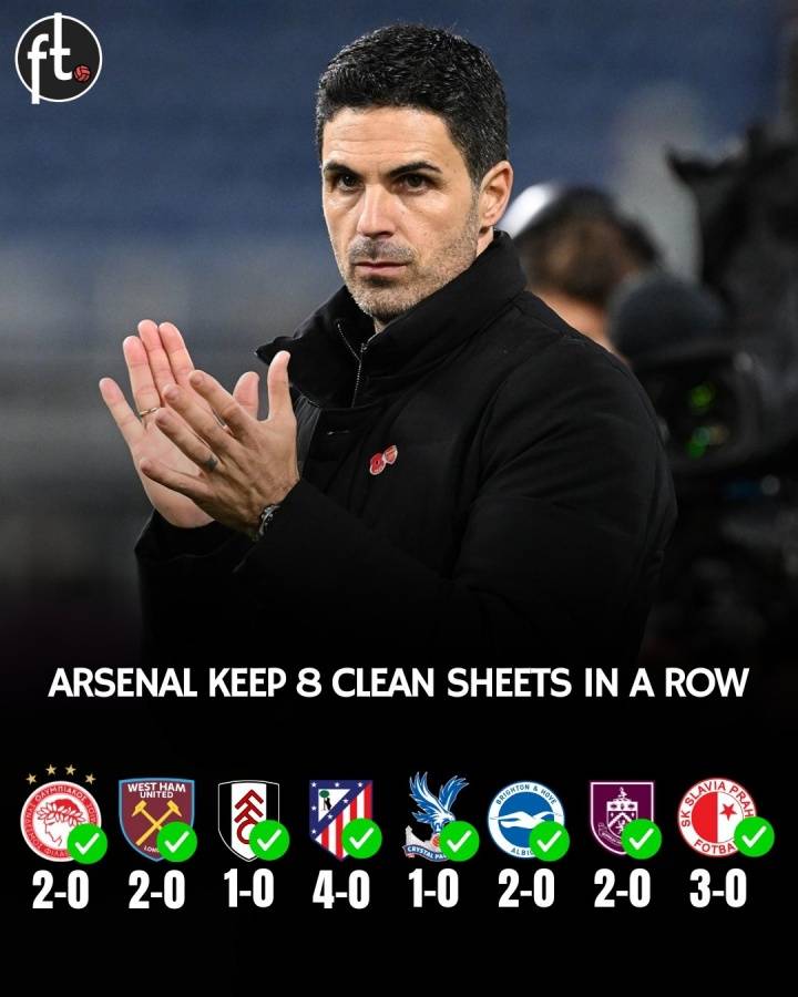 据统计,阿森纳目前已经在各项赛事取得十连胜,连续八场比赛实现零封,追平了俱乐部在1903年创造的最长零封场次纪录(8场)。本赛季至今,阿森纳仅丢了三球,均是在英超赛场。