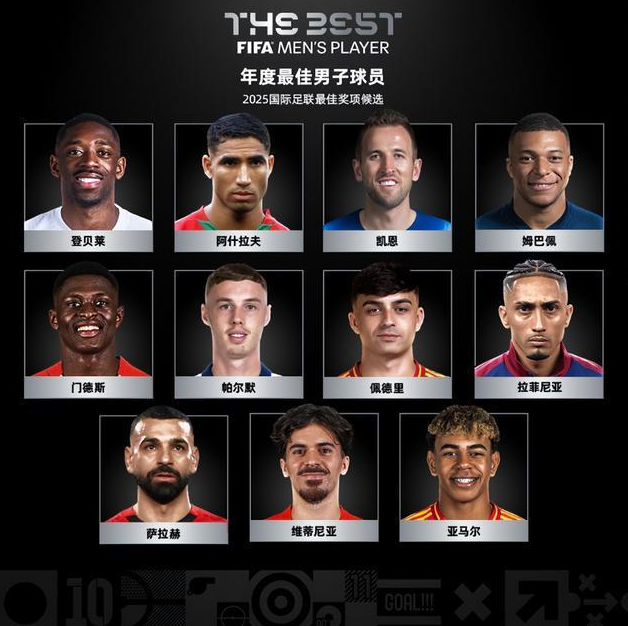 11月7日,FIFA国际足联公布了2025年年度最佳男子球员的11人候选名单。登贝莱、姆巴佩、亚马尔、凯恩等人在列,曼城哈兰德则无缘入选。