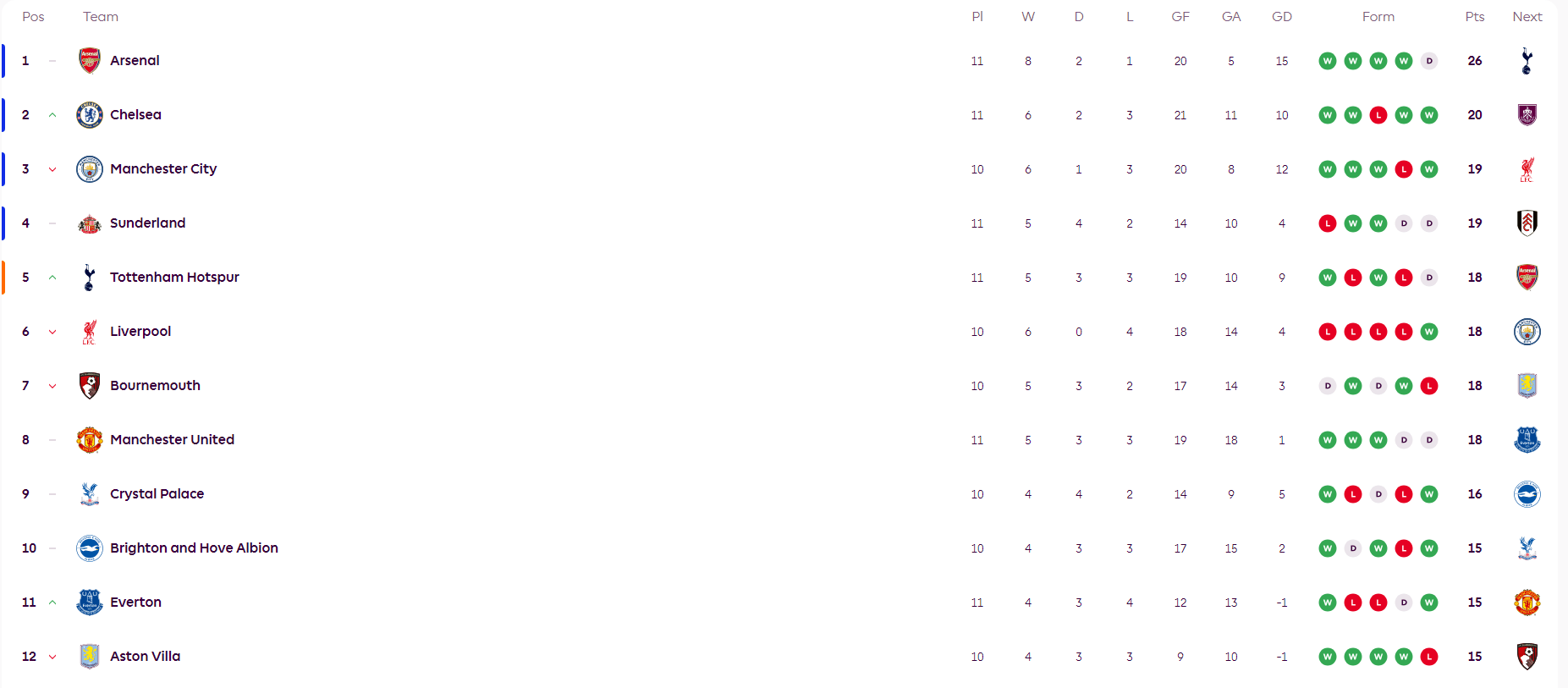 北京时间11月9日,英超联赛第11轮先赛半数,积分榜情况如下: