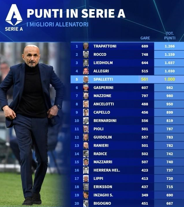 尤文0比0都灵,凭借这场平局,斯帕莱蒂拿到执教生涯意甲第1000分,成为特拉帕托尼、罗科、利德霍尔姆和阿莱格里之后,第5位在意甲中达到 1000 分里程碑的教练(胜场按3分计算,对手弃权算胜)。 在这561场意甲比赛中,斯帕莱蒂先后带领恩波利(34场37分)、桑普多利亚(28场34分)、威尼斯(17场15分)、乌迪内斯(117场178分)、罗马(211场422分)、国际米兰(76场141分)、那不勒斯(76场169分)和尤文图斯(2场4分),取得了289胜133平139负的战绩。