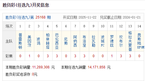 足彩25168期开奖结果:一等奖7注 单注奖金72.2万元
