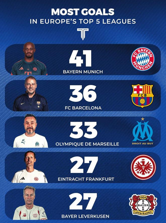 本赛季五大联赛俱乐部进球榜TOP5:拜仁11轮41球第一