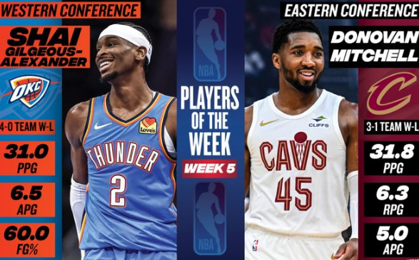 北京时间11月25日,NBA官方公布了第5周的周最佳球员。雷霆球星亚历山大当选西部周最佳球员,而东部周最佳的奖项属于骑士球星米切尔。这是亚历山大生涯第8次当选周最佳,也是本赛季第2次当选。这是米切尔生涯第9次当选周最佳,本赛季首次当选。东契奇、哈登、约基奇等球星获得提名。