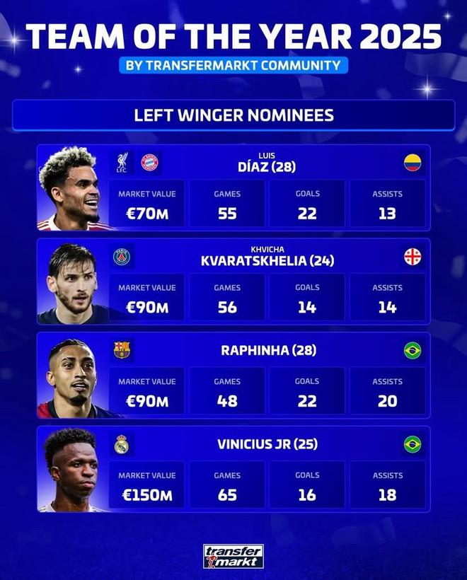 时间:2025-12-05 16:01:24北京时间12月5日,正在评选2025年度最佳阵容的德转列出了最佳左边锋的四名候选者,拜仁慕尼黑的路易斯-迪亚斯、巴黎圣日耳曼的克瓦拉茨赫利亚、巴塞罗那的拉菲尼亚以及皇家马德里的维尼修斯上榜。