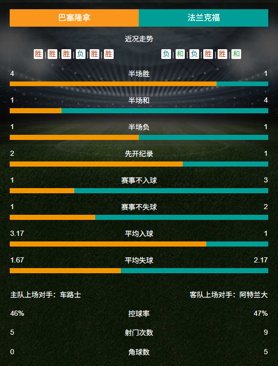 11月26日作客挑战车路士的欧冠联比赛中,巴塞遭遇了一场溃败,不仅朗奴.阿拉奥祖领到红牌被罚离场(今仗停赛受罚),全场下来控球率、射门次数以及角球等高阶数据全方位处于下风,最终以0比3惨败收场。此役过后,巴塞在西甲当中慢慢找到信心,先后击败艾拉维斯、马体会与贝迪斯从而喜迎一波联赛三连胜。随着最大竞争者皇马近期接连犯错,巴塞目前在西甲16轮战罢已积40分领跑积分榜。正因如此,巴塞众将可以把更多心思放在欧冠联当中。今届欧冠联联赛阶段前5场战罢,巴塞录得2胜1和2负手握7分,他们想要直接拿到晋级资格最后3场必须保持全胜。有利的是,罗拔.利云度夫斯基在德甲效力期间面对法兰克福屡有好表现。据统计,这位波兰球星职业生涯至今24次对阵法兰克福攻入16球和4次助攻,最终球队战绩为16胜3和5负。不仅如此,费历克执教德甲期间对法兰克福也是非常了解,清楚对方的战术以及优缺点,4次与之较量的战绩为3胜1负,期间每场都使用4-2-3-1阵式。再加上队内新星拉米尼.耶马近期在前腰位置发挥出色,更加丰富费历克的战术选择。因此巴塞是役主场出击值得看高一线。阵容方面,丹尼.奥莫和柏保路.加维因伤缺席。