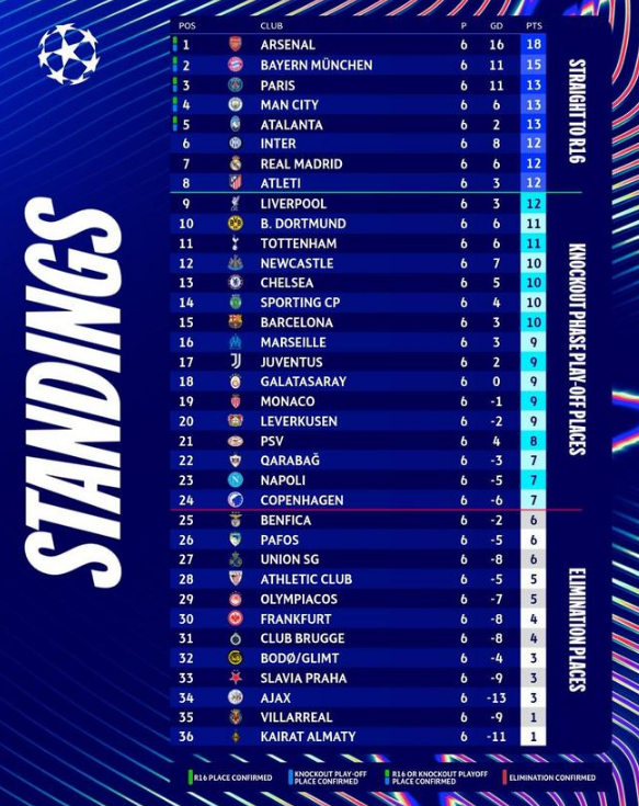 北京时间12月11日,欧冠联赛第六轮比赛全部结束,联赛阶段的比赛还剩2轮,目前阿森纳、拜仁、巴黎、曼城、亚特兰大确认晋级欧冠16强或附加赛。