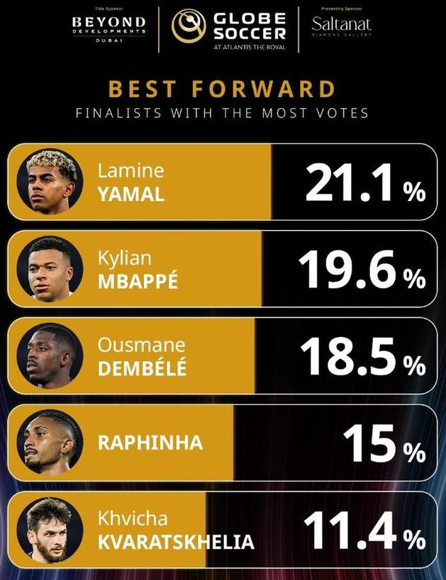 环足奖25年最佳前锋:亚马尔第一 姆巴佩、登贝莱二三