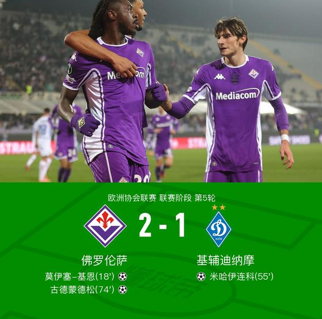 北京时间12月12日,欧洲协会联赛联赛阶段第5轮展开较量,佛罗伦萨迎战基辅迪纳摩。比赛中,多多送出助攻,莫伊塞-基恩接球后完成破门,为球队取得领先。随后,皮哈洛诺克助攻米哈伊连科推射得手,将比分扳平。比赛进入尾声阶段,古德蒙德松挺身而出,攻入关键一球,帮助球队再度建立优势。最终全场比分为2-1,佛罗伦萨战胜基辅迪纳摩。