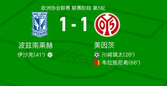 波兹南莱赫1-1美因茨,弗赖堡1-0萨尔茨堡红牛