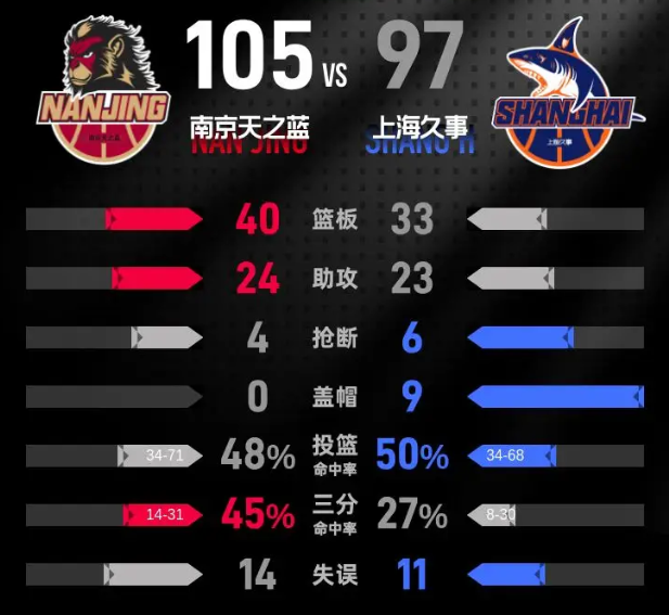 第四节,南京天之蓝状态依然火热,在开局阶段以一波进攻将优势扩大至16分。随着比赛进行,上海久事展开有效反击,将分差缩小至5分,构成一定威胁。然而,南京天之蓝保持高效的进攻,在比赛末段再次扩大领先,最终以105-97赢得比赛,顺利锁定胜局。