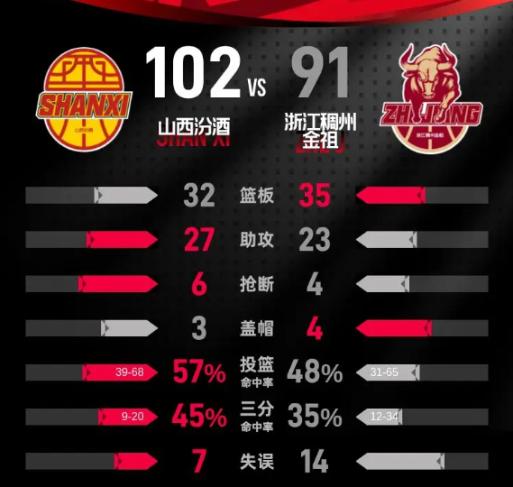 在第四节的初段,山西汾酒逐渐找回状态,通过有效的进攻手段连续得分,很快将比分追平并一举反超13分。浙江稠州金租虽然努力调整战术以缩小分差,但山西汾酒的攻势势不可挡。本节比赛中,山西汾酒的贾明儒表现尤为出色,独得11分,包括3记三分球。最终,第四节结束时,山西汾酒以102-91赢下比赛,成功锁定胜局。