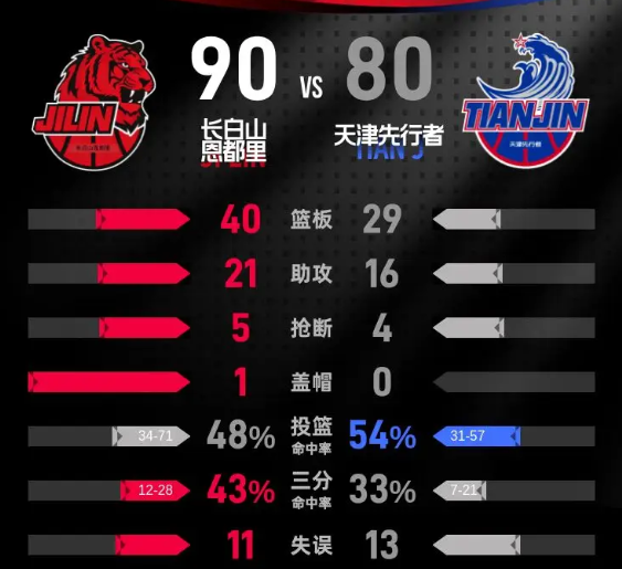 长白山恩都里队:达拉斯·摩尔23分8篮板6助攻、德万特·威尔逊22分14篮板2助攻、姜伟泽14分1篮板4助攻、贾昊13分5篮板2助攻、曾繁日4分2助攻、刘雁宇4分2篮板2助攻、杨腾飞3分1助攻、栾利程3分1篮板、段立谦2分、泽文赛尔·阿普森2分4篮板2助攻。
