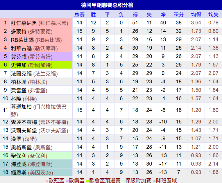 积分榜方面,凭借着巨大的净胜球优势,拜仁可以说已经提前锁定半程冠军。多特今天主场完胜门兴后,近8轮5胜3平保持不败,暂时超过莱比锡升至第2,落后榜首的拜仁6分。门兴输球还是排在第11,比降级区高了5分。