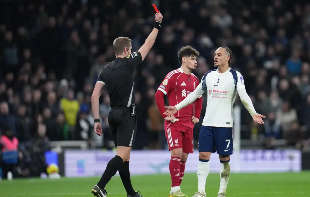 第30分钟,西蒙斯踩踏范迪克的小腿,随后VAR介入比赛,当值主裁布鲁克斯在第33分钟向西蒙斯直接出示红牌,主场作战的热刺少一人作战。