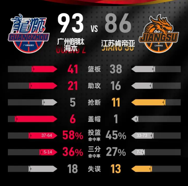 第四节,江苏肯帝亚开始奋起直追,迅速将比分追至63-69。然而,广州朗肽海本通过一波犀利的进攻,将分差扩大到15分。尽管江苏肯帝亚在小节后段努力追赶,重新拉近了比分,但最终以93-86落败,广州朗肽海本赢得比赛。