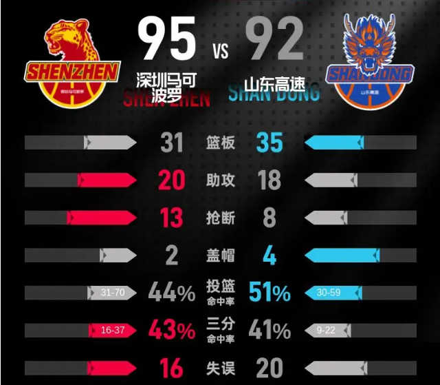 第四节,双方展开激烈争夺,山东高速与深圳马可波罗的分数不断交替上升,双方在场上互不相让,战况胶着。山东高速的马基斯·克里斯在本节砍下11分,展现了出色的得分能力。最终,凭借着王浩然终场前1秒的三分绝杀,深圳马可波罗以95-92赢得比赛。