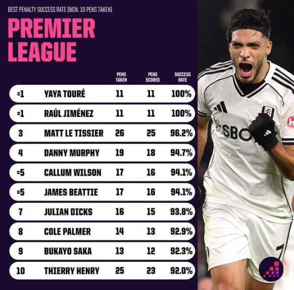 这是希门尼斯在英超联赛中第11次主罚点球,他依然保持着11罚11中的惊人纪录。