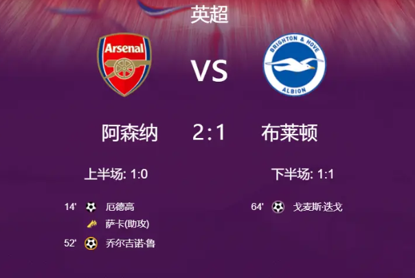 最终,阿森纳2-1战胜布莱顿,仍以2分优势领跑英超积分榜。