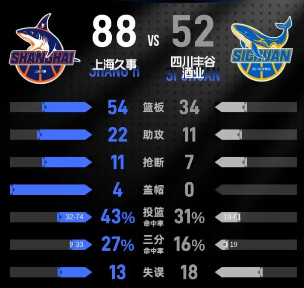 第四节,比赛开局阶段,上海久事的手感略显不佳,双方分差缩小至28分。然而,随着比赛的推进,上海久事逐渐恢复状态,通过一波高效进攻将优势扩大到39分。在小节后段,四川丰谷酒业再度尝试追分,但终究无法逆转。最终,上海久事以88-52赢下整场比赛。