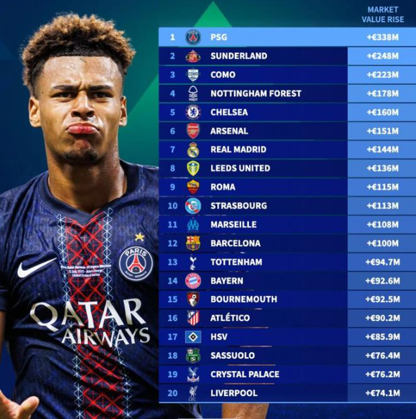 2025年俱乐部身价涨幅:巴黎涨3.38亿第1,利物浦第20