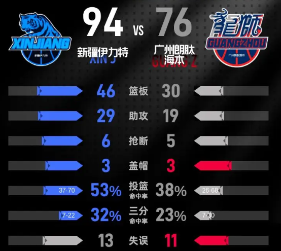 第四节,广州朗肽海本积极展开反击,将比分差距缩小至15分。尽管如此,新疆伊力特依旧保持稳定的进攻节奏,有效地扩大领先优势,最终以94-76赢得比赛。