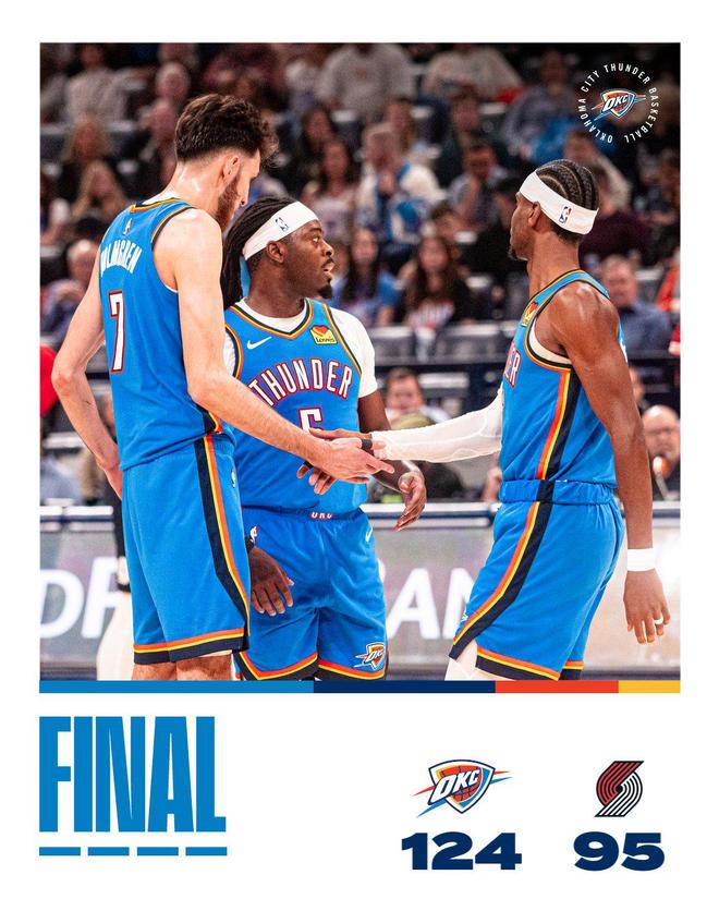 雷霆队的亚历山大得到30分和6次助攻,米切尔得到17分和5个篮板,乔得到15分,威廉姆斯得到13分、7个篮板和7次助攻,霍姆格伦得到12分和10个篮板,多尔特得到12分,卡森得到12分和7个篮板。开拓者队的西索科得到19分,阿夫迪亚得到17分、7个篮板和7次助攻,夏普得到14分和4个篮板,勒夫得到10分、5个篮板和4次助攻,穆雷得到10分。杨瀚森替补出场10分50秒,4投1中,三分球2投1中,得到3分和5个篮板。