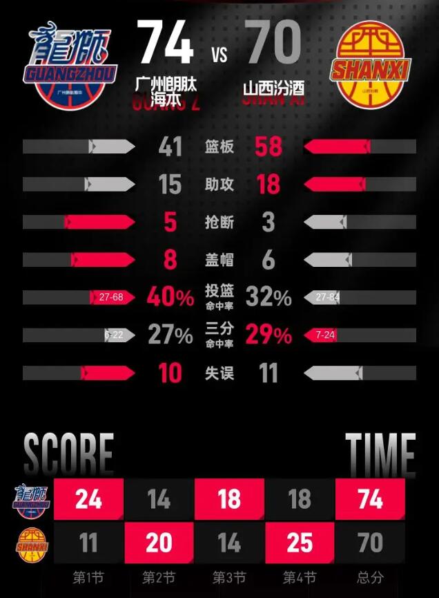 第四节,山西汾酒展开猛攻,将分差缩至2分。但广州朗肽海本很快调整状态,再次发起进攻,巩固了自己的优势。比赛中,山西汾酒的原帅表现出色,斩获12分,其中包括两记三分球。最终,第四节结束时,广州朗肽海本以74-70赢得比赛。